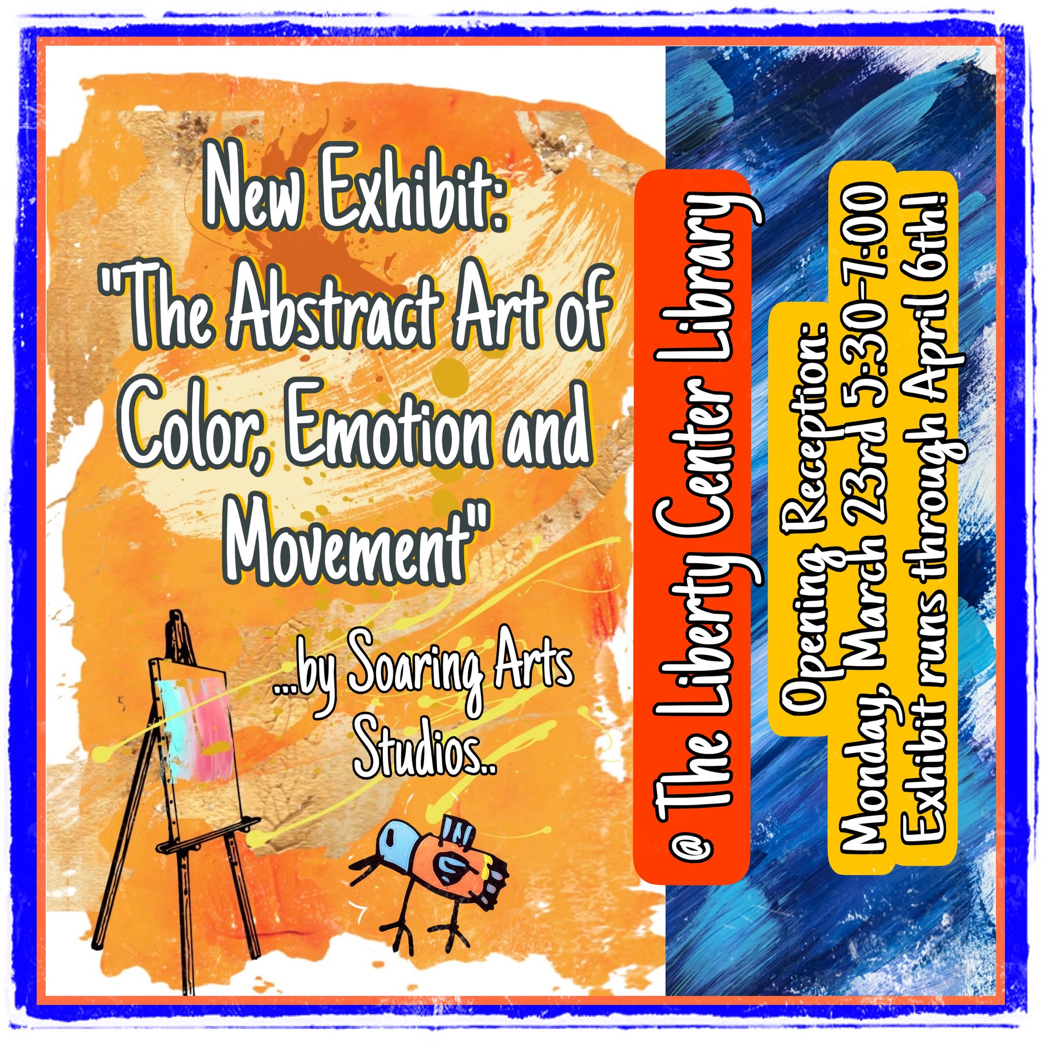 You are invited to come the Opening of “The Abstract Art of Color, Emotion and Movement,” which is a new Soaring Arts Exhibit, being held at the Liberty Center Public Library! It will feature abstract art, created throughout our “Going Deeper Series!” See Squegee art by Christina, Kinetic Art by Aric and Jess, pendulum art and more!