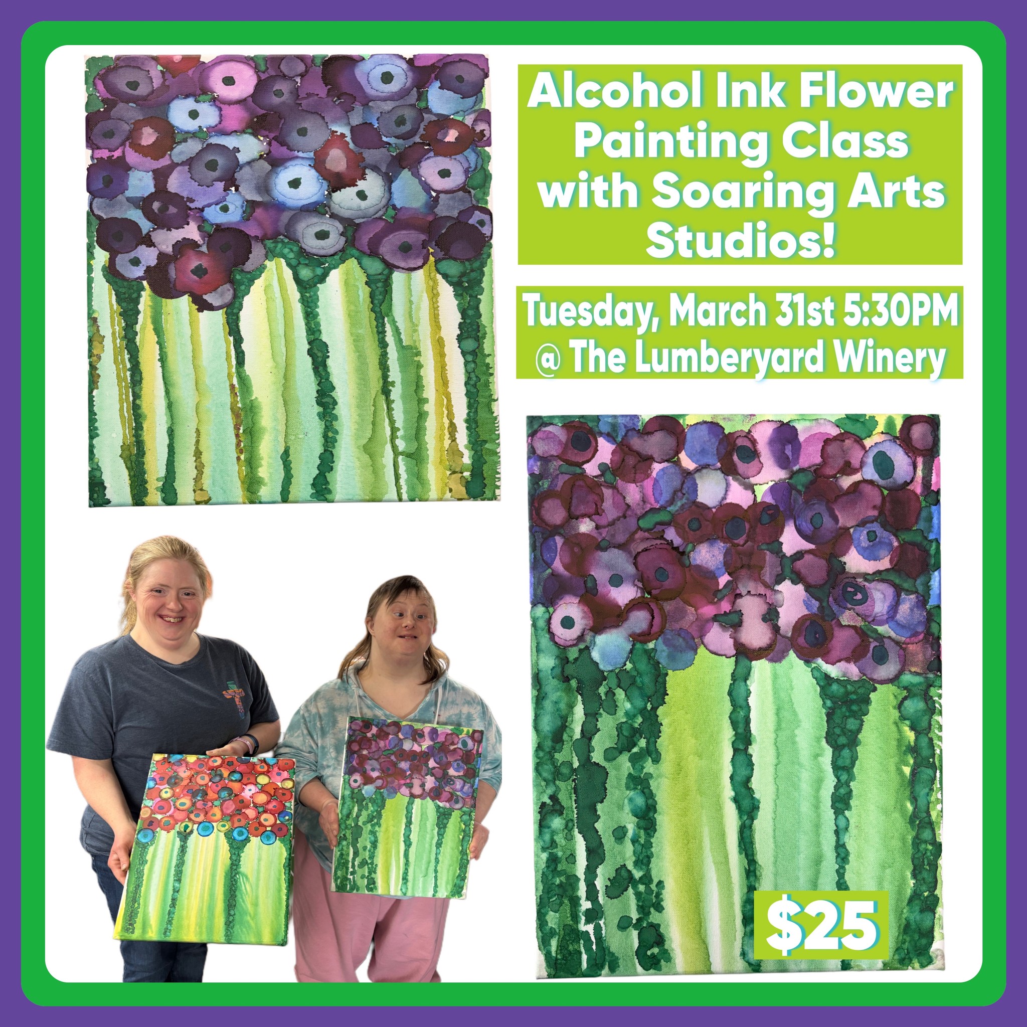 Join Soaring Arts Studios at the Lumberyard Winery on Tuesday, March 31 for a great night out! You’ll learn the basics of using alcohol inks to paint by creating these beautiful abstract flowers!